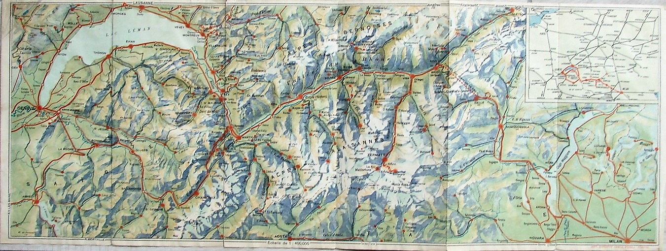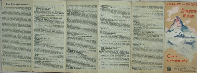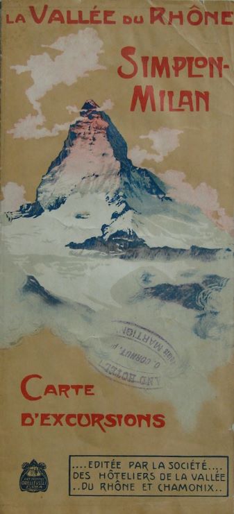 Carte d’excursions, la Vallée du Rhône, Simplon-Milan, éditée par la société des hôteliers de la vallée du Rhône et Chamonix, ca 1935