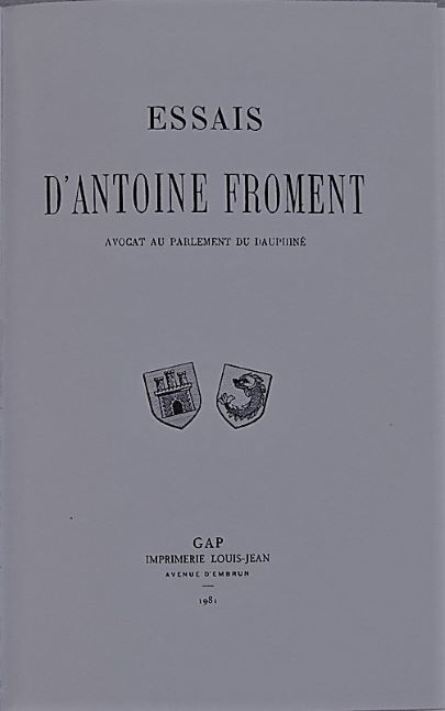 Essais d’Antoine Froment avocat au parlement du Dauphiné sur l’incendie de sa patrie, les singularités des Alpes en la principauté du Briançonnais, avec plusieurs autres curieuses remarques sur le passage du Roy aux Italies, ravages des loups, pestes, famines, avalanches et embrasements de plusieurs villages, reprint de l’édition originale 1868, tirage limité à 200 exemplaires, éd. imprimerie Louis-Jean, Gap 1981