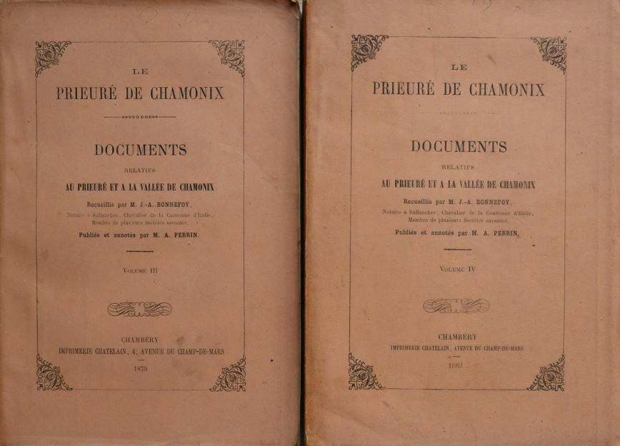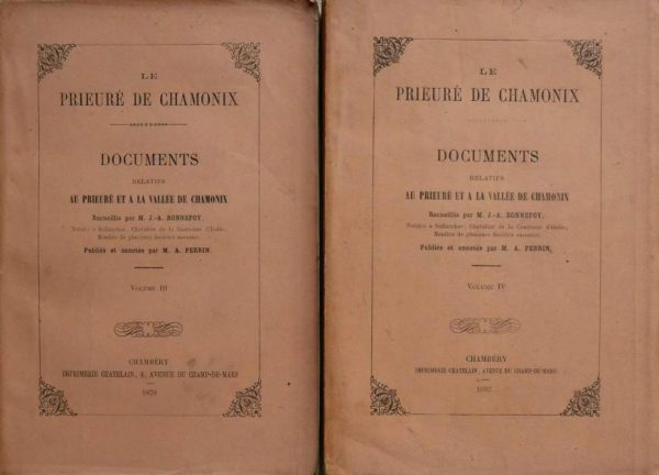 Librairie A. Perrin, Chambéry, 1887, édition originale, rare, complété par 2 volumes “Documents relatifs au Prieuré et à la Vallée de Chamonix”, volume III et IV par André Perrin et Jacques -Adrien Bonnefoy, éd. Chambéry, 1879 et 1883
