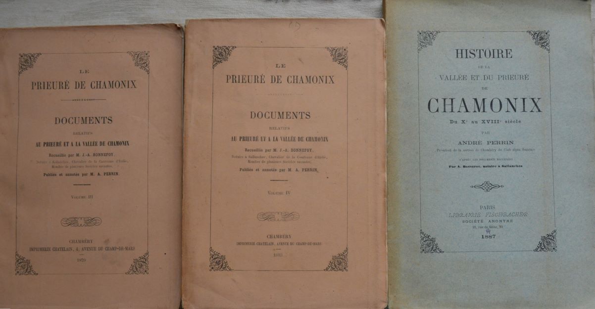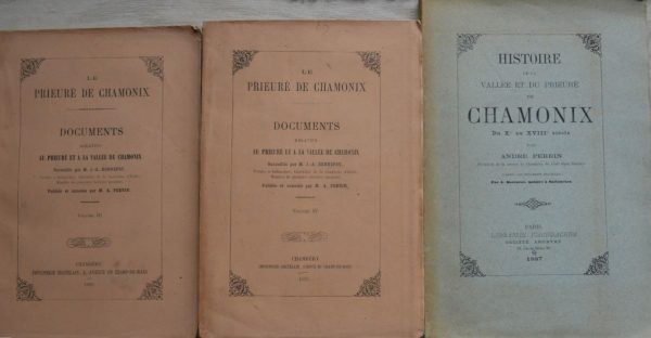 Histoire de la vallée et du prieuré de Chamonix, Perrin, 1887, + Documents relatifs au Prieuré, 2 volumes, 1879 et 1883