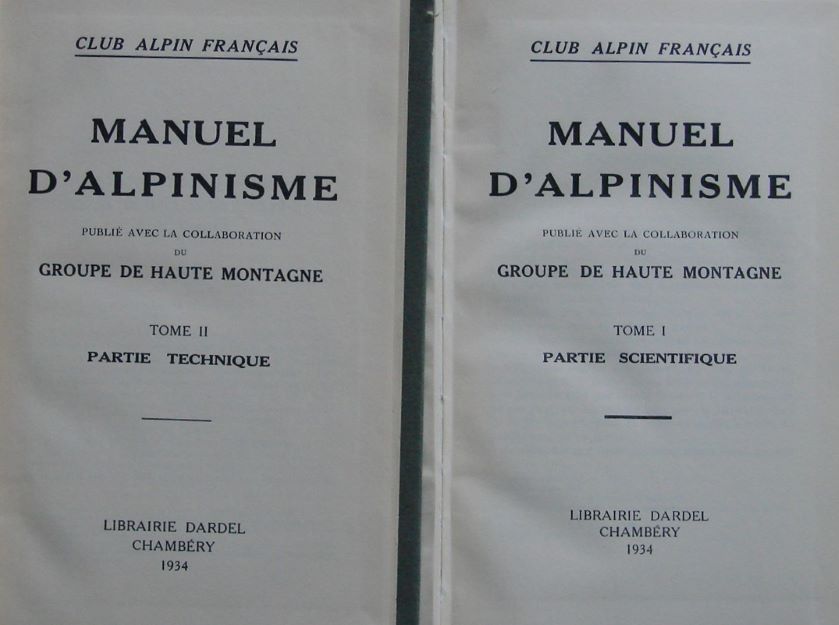 Manuel d’alpinisme tome I : partie scientifique, tome II : partie technique publié avec la collaboration du Groupe de Haite Montagne, Club Alpin Français, éd. Librairie Dardel, Chambéry, 1964, édition orignale